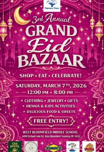 HomeDetroit Metro Area Events West Bloomfield, MI Events 3rd Grand Annual EID Bazaar In MI Fusion Show & EventsExhibitionFood & DrinkHindiUrduMultilingualEnglish 3rd Grand Annual EID Bazaar In MI Sat, Mar 7 at 12:00 PM(EST) West Bloomfield Middle School, 6000 Orchard Lake Rd Township, West Bloomfield, MI 48322 Register Shortlist Add to Calendar Share Report Comments