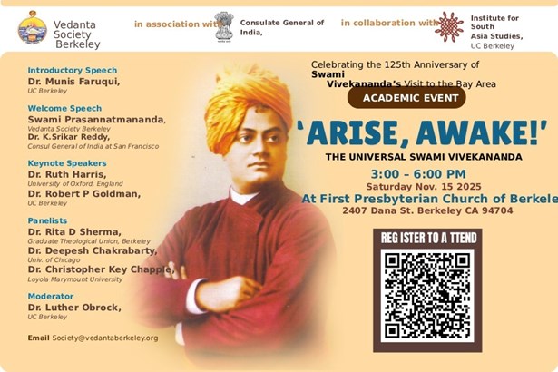 RegisterEvent InfoVenueArtists Info Videos GalleryT & C FAQ Covid-19 Info Buzz Ticket Information GENERAL 0 1 2 3 4 5 6 7 8 9 100 0 Tickets / Free: Register Order Summary Tickets Order Summary Event Details Celebrating the 125th Anniversary of Swami Vivekananda’s Visit to the Bay Area!Vedanta Society Berkeley in association with the Consulate General of India, San Francisco and in collaboration with Institute for South Asia Studies, UC Berkeley Swami Vivekananda influenced several scholars in the U.S., Europe, and India in many fields during his lifetime. As part of the year-long celebrations to mark Swamiji' s visit to the Bay Area in 1900, you are invited to an engaging academic discussion on Swami Vivekananda on Saturday Nov. 15th at 3pm at the First Presbyterian church in Berkeley at 2407 Dana St. Berkeley CA 94704.Event includes very eminent speakers from great universities:Keynote speaker Dr. Ruth Harris, author of the book Vivekananda: Guru to the World, Oxford University in EnglandDr. Dipesh Chakravorty, the Lawrence A. Kimpton Distinguished Service Professor of History, South Asian Languages and Civilizations, and the College, University of Chicago Dr. Robert Goldman, Professor of the Graduate School and Catherine and William L. Magistretti Distinguished Professor of Sanskrit Emeritus and author of a highly authoritative translation of Ramayana, University of California BerkeleyA panel discussion will feature:Dr. Rita D Sherma, Graduate Theological Union, Berkeley, CA Dr. Christopher Key Chapple, Loyola Marymount University, Los Angeles, CA Dr. Luther Obrock, UC Berkeley, CA Please register at this link : Resgistration Link The event is free and open to all. Visit https://www.vedantaberkeley.org. Email: society@vedantaberkeley.org Venue Details First Presbyterian Church of Berkeley2407 Dana St , Berkeley , CA 94704 X Report Error Is the information provided incorrect? Report it now! Event has been cancelled Event has been postponed This is an Adult event Event is fake/Inappropriate/Duplicate This event is a spam Please remove this event This event is private Terms & Conditions1. Tickets once purchased cannot be modified or cancelled. Refunds will be initiated only in case of event cancellation. 2. Transaction fee per ticket may be levied. Please check the total amount before payment. 3. Organizers hold the right to deny late entry to the event. Hence, we recommend reaching the venue an hour before the event starts to ensure smooth entry. 4. If an event is canceled/postponed, Sulekha will refund only the face value of the ticket and NOT the transaction fee. 5. Every venue has its own rules and regulations. They hold the right to deny entry on the basis of the same. 6. These terms and conditions are subject to change from time to time at the discretion of the organiser. 8. As per current Bay Area mandatory health requirements, all attendees must present proof of a COVID-19 vaccination in order to enter the venue and attend the show. 9. Mask wearing is mandatory for all. 10. The venue reserves the right to alter safety protocols at any time and at its sole discretion of the management. 11. The event organizers value the safety of our audiences, artists, and staff. FAQ's How do I purchase tickets? There are several options when buying tickets: You can purchase any ticket to any events listed on our website. To buy, select the # of tickets you want to purchase in the dropdown of a specific event and follow the instructions. Email. Not sure where to go or how to buy tickets? Email us at us.sulekha@sulekha.com. Phone. You can purchase tickets over the phone 1-512-788-5300 (Mon to Fri - 11am to 8pm – EST) What is Sulekha's Refund Policy? All sales are final. No Refunds will be issued under any circumstance unless an event is canceled or rescheduled. If you event is canceled, in most cases you won't need to do anything. We will inform you about the cancelation and face value of the ticket will be refunded to your account, NOT the transaction fee. Refund will be processed by the same payment method used for purchase. By purchasing tickets you are accepting these terms. If you have any questions, please email us at us.sulekha@sulekha.com or call 1-512-788-5300 (Mon to Fri - 11am to 8pm – EST) Covid-19 Info Protecting Yourself Please follow the preventative measures recommended by the WHO and local authorities and public health agencies like the CDC. Please contact the event organizers to learn what they are doing to keep event attendees safe and healthy. What you should know before you go? Before you purchase your ticket or head to an event, it is important to understand the health guidelines and entry requirements. Event Organizers have adopted to ensure the safe return of live events. What is a Health Check? Health Checks are safety protocols instituted by Event Organizers to help reduce attendee exposure to COVID-19. Sulekha does not set or control Health Check guidelines, which is why different events you see in our marketplace may have different protocols. While specific requirements vary across venues and events, some common measures may include, but are not limited to: proof of full vaccination against COVID-19, proof of a negative COVID-19 diagnostic test result prior to entering the event, a rapid onsite COVID-19 test, or participating in a brief health questionnaire. Who decides if a Health Check is required? In partnership with local health departments and government guidelines, the Event Organizer monitors local COVID-19 trends and determines if Health Checks will be required to attend an event. In some instances, an Event Organizer may choose to exceed protocols mandated by local governments. Check with your Event Organizer to know the updates and guidelines. Is Sulekha requiring proof of vaccination or a negative COVID-19 diagnostic test for entry? No, Sulekha does not set or control Health Check guidelines. Certain Event Organizers are opting to require entry qualifica
