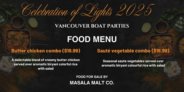 Light meals will be available for purchase during the cruise, prepared fresh by Masala Malt Co. Options include: