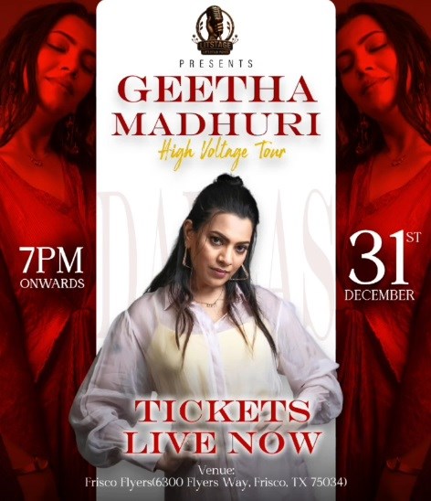 Get ready to ring in 2026 with the biggest, loudest, and most electrifying Telugu Musical Night Texas has ever seen! Litstage Entertainments is proud to bring you the "Queen of Mass Beats," the sensational GEETHA MADHURI, LIVE for an exclusive New Year's Eve Concert!