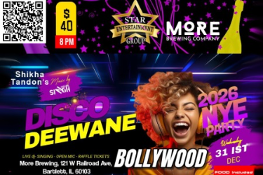 Disco Deewane Bollywood 2026 NYE Party in Illinois. DEC 31, 8:00PM (CST) More Brewing Company, 121 W Railroad Ave, Bartlett, IL Star entertainment $40 Buy Tickets