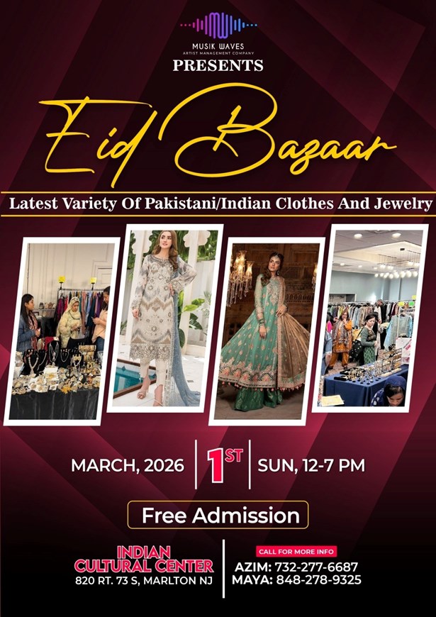 Event InfoVenueArtists Info Videos GalleryBuzz Event Details South Jersey biggest Eid Bazaar. Over 40 vendors carrying latest collection of Pakistani & Indian clothes and jewelry. Best place for all your last minute Eid shopping. Venue Details Indian Cultural Center820 Route 73 S , Marlton , NJ 08053 X Report Error Is the information provided incorrect? Report it now! Event has been cancelled Event has been postponed This is an Adult event Event is fake/Inappropriate/Duplicate This event is a spam Please remove this event This event is private