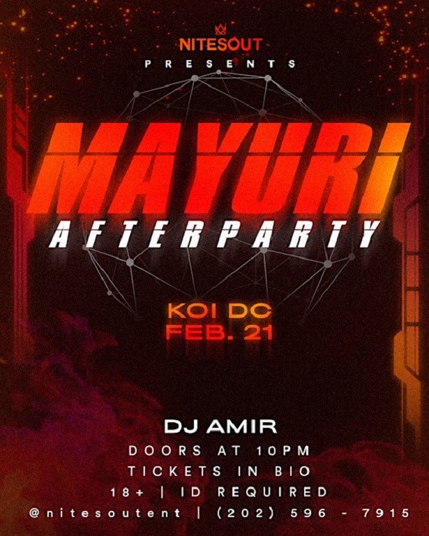HomeWashington Metro Area Events Washington, DC Events MAYURI AFTERPARTY 2026 - Presented by NitesOut & Maryland Mayuri! Bollywood PartyNight PartyHindi MAYURI AFTERPARTY 2026 - Presented by NitesOut & Maryland Mayuri! Sun, Feb 22 at 11:00 PM(EST) KOI Sushi Lounge, 1413 K St NW, Washington, DC 20005 Shortlist Add to Calendar Share Report Comments