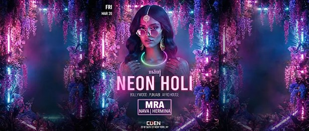 This event has ended on 20th Mar, 2026 HomeNew York Metro Area Events New York, NY Events Neon Holi | Bollywood x Punjabi Holi Neon Holi | Bollywood x Punjabi Fri, Mar 20 at 10:00 PM(EST) EDEN, 20 West 36th Street, New York, NY 10018