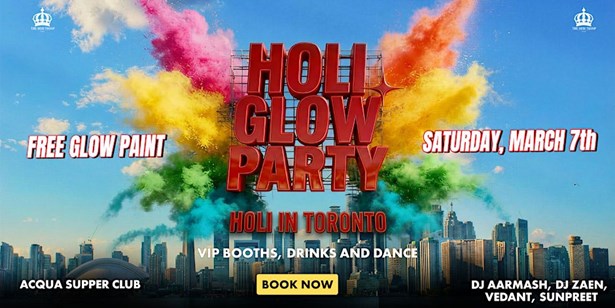 This event has ended on 7th Mar, 2026 HomeToronto Metro Area Events Toronto, ON Events The Holi Glow Party HoliHindi The Holi Glow Party Sat, Mar 7 at 10:00 PM(EST) Acqua Supper Club, 50 Prince Edward Island Crescent, Toronto, ON M6K 3C3