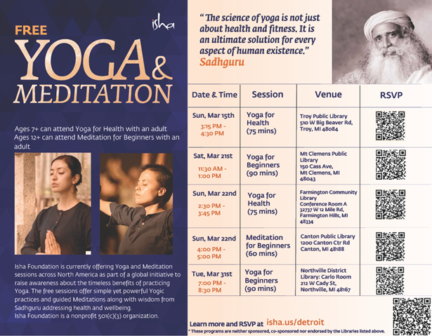 RegisterEvent InfoVenueArtists Info Videos GalleryT & C FAQ Covid-19 Info Buzz Ticket Information RSVP: https://online.innerengineering.com/en/event-details/22526 0 1 2 3 4 5 6 7 8 9 100 0 Tickets / Free: Register Order Summary Tickets Order Summary Event Details RSVP: https://online.innerengineering.com/en/event-details/22526This session includes simple yet powerful tools to manifest health and vitality in one’s body and life.Benefits:Stretches and activates the spine to relieve back painReduces stress and anxietyEnhances mental clarity, focus, and emotional balanceVenue: Farmington Community Library Time: 22nd March 2026; 14:30 - 15:45Venue Details Finnish community Library32737 West 12 Mile Road , Farmington , MI 48334 X Report Error Is the information provided incorrect? Report it now! Event has been cancelled Event has been postponed This is an Adult event Event is fake/Inappropriate/Duplicate This event is a spam Please remove this event This event is private Terms & Conditions1. Tickets once purchased cannot be modified or cancelled. Refunds will be initiated only in case of event cancellation. 2. Transaction fee per ticket may be levied. Please check the total amount before payment. 3. Organizers hold the right to deny late entry to the event. Hence, we recommend reaching the venue an hour before the event starts to ensure smooth entry. 4. If an event is canceled/postponed, Sulekha will refund only the face value of the ticket and NOT the transaction fee. 5. Every venue has its own rules and regulations. They hold the right to deny entry on the basis of the same. 6. These terms and conditions are subject to change from time to time at the discretion of the organiser. 8. As per current Detroit Metro Area mandatory health requirements, all attendees must present proof of a COVID-19 vaccination in order to enter the venue and attend the show. 9. Mask wearing is mandatory for all. 10. The venue reserves the right to alter safety protocols at any time and at its sole discretion of the management. 11. The event organizers value the safety of our audiences, artists, and staff. FAQ's How do I purchase tickets? There are several options when buying tickets: You can purchase any ticket to any events listed on our website. To buy, select the # of tickets you want to purchase in the dropdown of a specific event and follow the instructions. Email. Not sure where to go or how to buy tickets? Email us at us.sulekha@sulekha.com. Phone. You can purchase tickets over the phone 1-512-788-5300 (Mon to Fri - 11am to 8pm – EST) What is Sulekha's Refund Policy? All sales are final. No Refunds will be issued under any circumstance unless an event is canceled or rescheduled. If you event is canceled, in most cases you won't need to do anything. We will inform you about the cancelation and face value of the ticket will be refunded to your account, NOT the transaction fee. Refund will be processed by the same payment method used for purchase. By purchasing tickets you are accepting these terms. If you have any questions, please email us at us.sulekha@sulekha.com or call 1-512-788-5300 (Mon to Fri - 11am to 8pm – EST) Covid-19 Info Protecting Yourself Please follow the preventative measures recommended by the WHO and local authorities and public health agencies like the CDC. Please contact the event organizers to learn what they are doing to keep event attendees safe and healthy. What you should know before you go? Before you purchase your ticket or head to an event, it is important to understand the health guidelines and entry requirements. Event Organizers have adopted to ensure the safe return of live events. What is a Health Check? Health Checks are safety protocols instituted by Event Organizers to help reduce attendee exposure to COVID-19. Sulekha does not set or control Health Check guidelines, which is why different events you see in our marketplace may have different protocols. While specific requirements vary across venues and events, some common measures may include, but are not limited to: proof of full vaccination against COVID-19, proof of a negative COVID-19 diagnostic test result prior to entering the event, a rapid onsite COVID-19 test, or participating in a brief health questionnaire. Who decides if a Health Check is required? In partnership with local health departments and government guidelines, the Event Organizer monitors local COVID-19 trends and determines if Health Checks will be required to attend an event. In some instances, an Event Organizer may choose to exceed protocols mandated by local governments. Check with your Event Organizer to know the updates and guidelines. Is Sulekha requiring proof of vaccination or a negative COVID-19 diagnostic test for entry? No, Sulekha does not set or control Health Check guidelines. Certain Event Organizers are opting to require entry qualifications for fans to attend their event. Additionally, some state and local governments are mandating Event Organizers to require health checks at entry. Check with your Event Organizer to know the updates and guidelines. I am ineligible for vaccination due to underlying health conditions, am I unable to attend an event requiring vaccination? Most Event Organizers requiring Health Checks will ask unvaccinated fans over 12 years old with a valid medical restriction & medical note to take a COVID-19 diagnostic test and provide proof of negative result prior to entering the venue. To know further details regarding the health checks and guidelines, please contact the Event organizers. You can also locate free testing in your area by using this helpful resource developed by the U.S. Department of Health & Human Services.